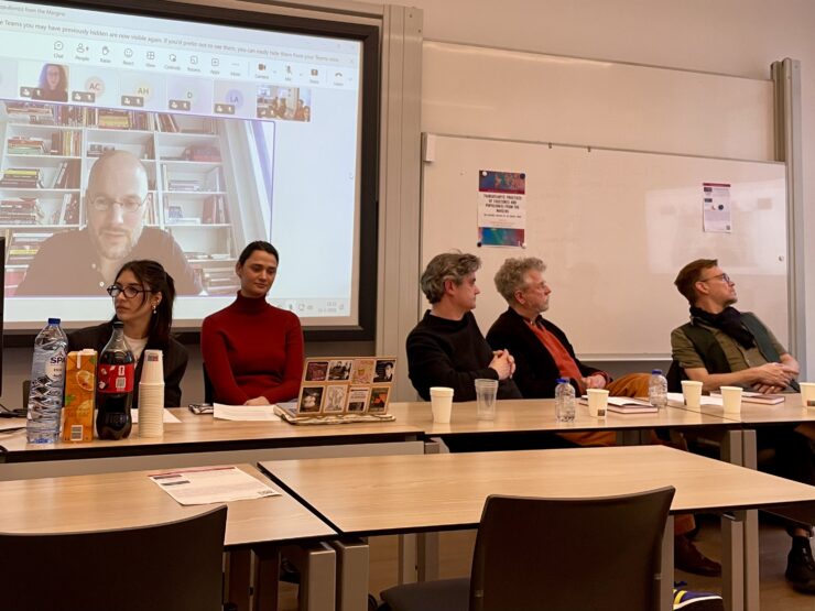 As part of a masterclass in the RMA Comparative Literary Studies, this event brought authors and respondents together to reflect on the publication of this volume. Moderated by students Eirini Arampatzi and Anouck Masse, the discussion was joined by Jonas Staal and Julienne Weegels who were able to participate online to give a short presentation on their chapters. Joost de Bloois, who also authored a chapter, attended in person to introduce his chapter alongside respondents Frans Willem Lantink and Rick Dolphijn.